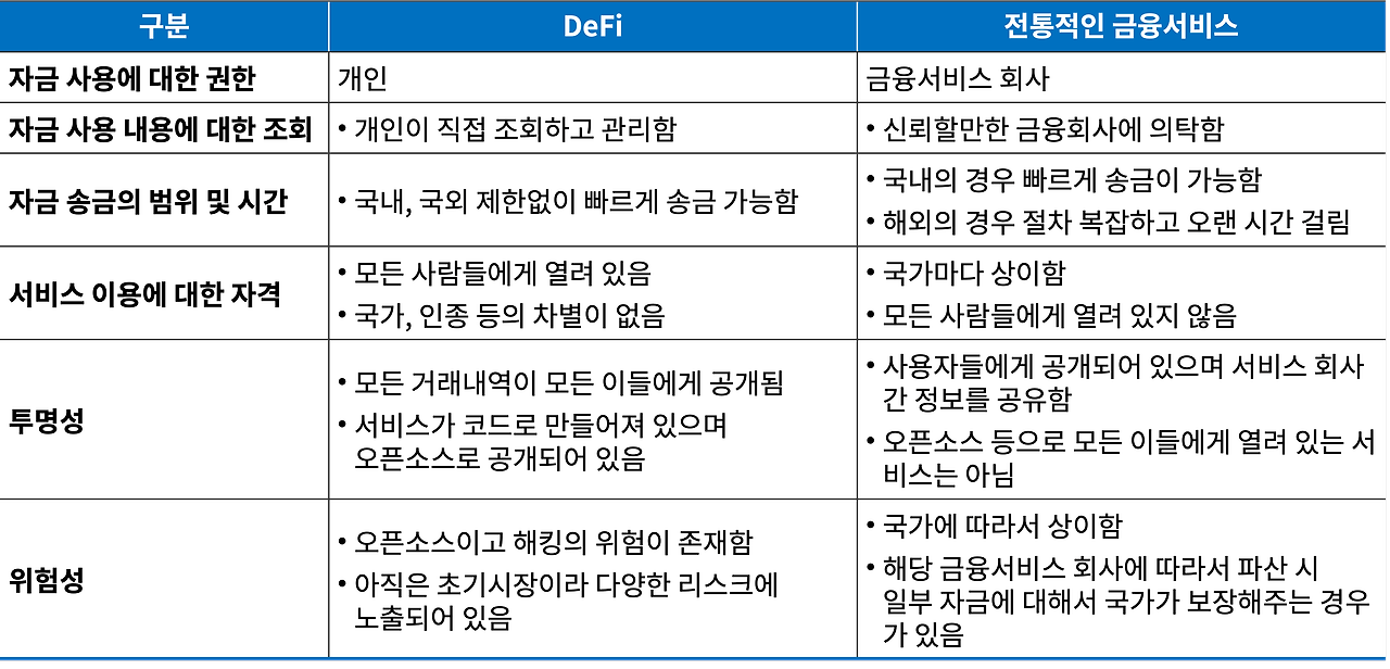 디파이는 개인의 자산을 직접 관리하고 거래할 수 있는 여지를 제공하지만, 전통 금융 시스템은 안정적인 관리와 규제를 제공합니다.