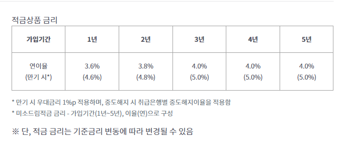 미소드림적금은 최대 50만원까지 지원해 주며 만기 5년 금리가 최대 10% 적금 상품입니다