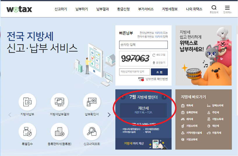 재산세는 현재 토지, 주택, 건축물, 선박, 항공기 보유한 자가 지방세를 납부하셔야 하는데 납부기간은 7월과 9월입니다. 1분기 납부기간은 7월31일까지입니다. 만약 납부기간 경과되면 1개월까지 가산세 3%가 부가됩니다.(예를들어 100만원 재산세라면 3만원 )부가가 되는겁니다. 그러니 잊지말고 납부 방법 가르쳐 드릴테니 바로 납부하시기 바랍니다. 납부하는데 1분이면 됩니다.
