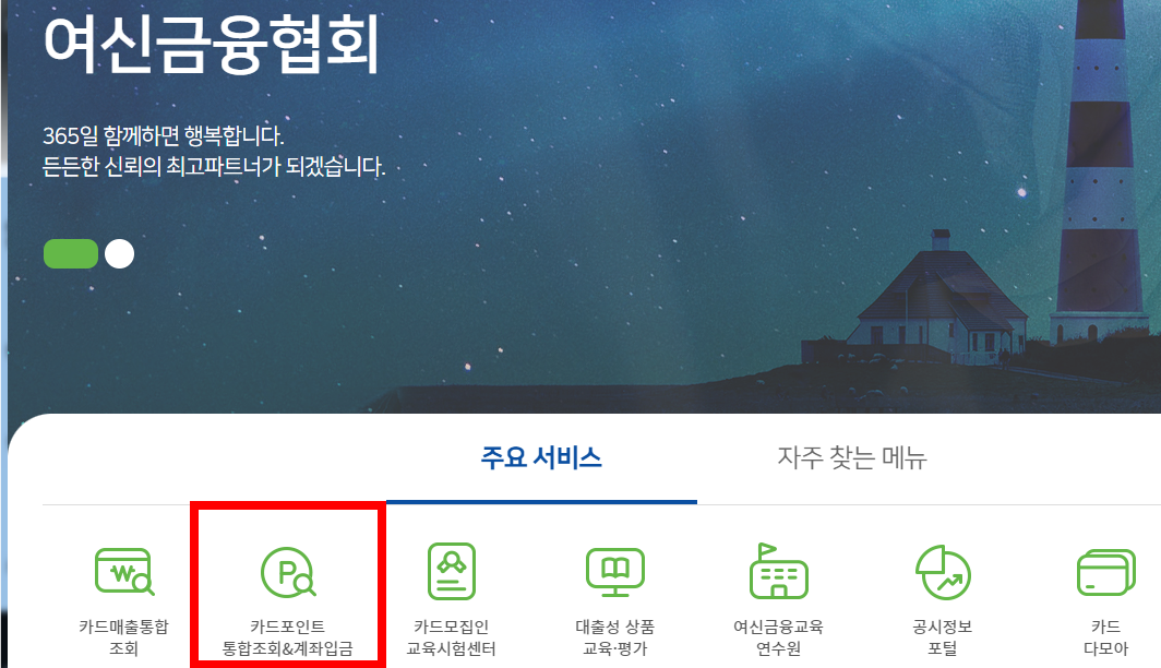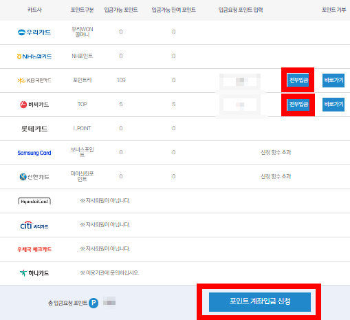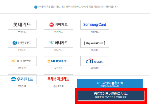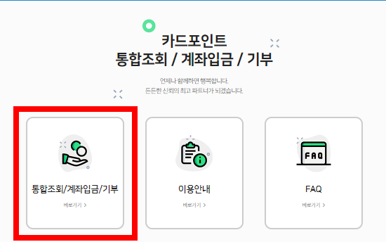 카드포인트 통합조회&계좌입금 →통합조회/계좌입금/기부→비회원조회하기→전체동의(체크)후 확인버튼→휴대폰인증 →위임동의(체크)후 다음버튼→카드포인트 계좌입금/기부→포인트 계좌입금신청→포인트계좌입금신청 →계좌번호 입금후 확인버튼